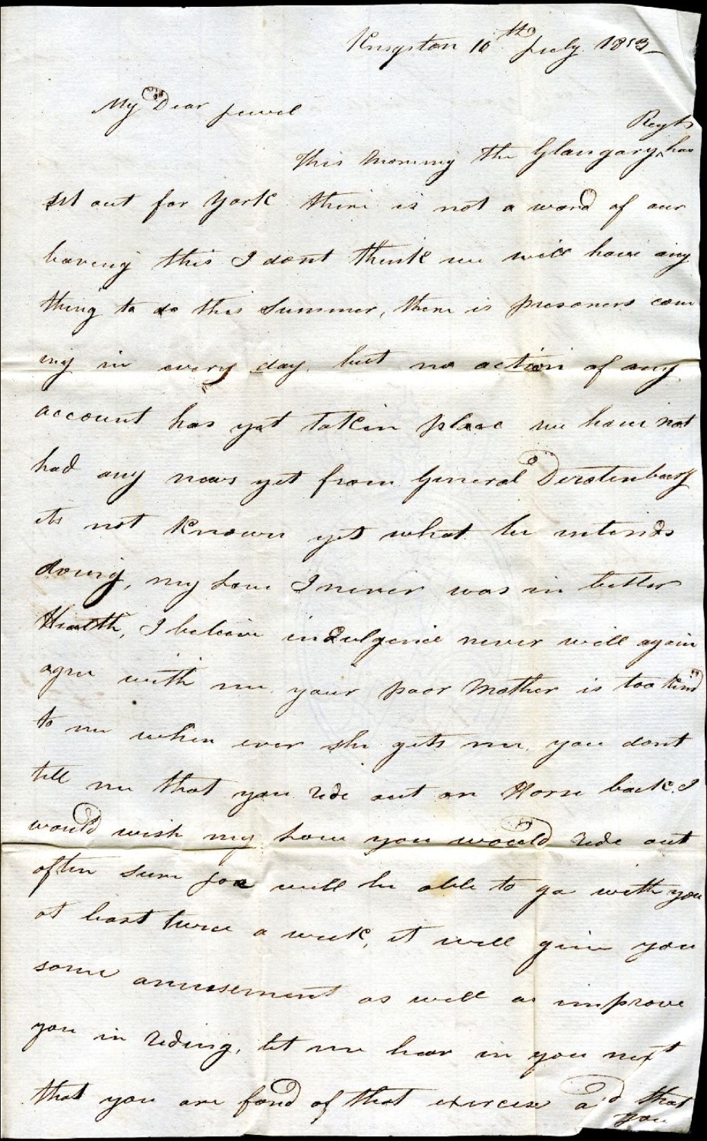 Lettre de Maurice Nowlan, lieutenant des grenadiers du 100e régiment, Kingston, à Agathe Perrault, Montréal, 10 juillet 1813, Archives nationales à Montréal, Fonds Maurice C. Nowlan, (06M,P146,S1,P16).