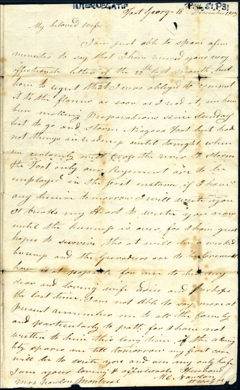 Lettre de Maurice Nowlan, lieutenant des grenadiers du 100e régiment, Fort George, à Agathe Perrault, Montréal, 18 décembre 1813, Archives nationales à Montréal, Fonds Maurice C. Nowlan, (06M,P146,S1,P31).