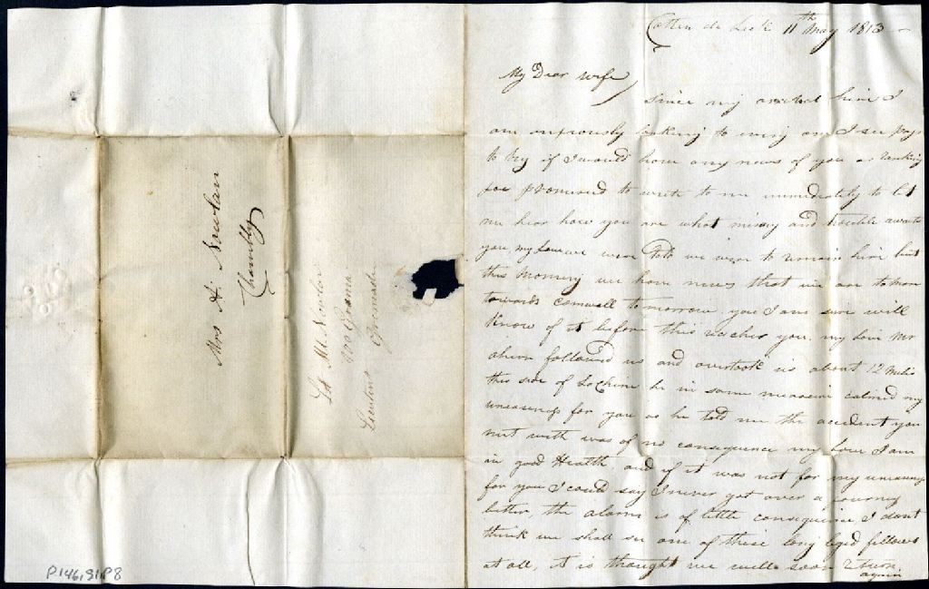 Lettre de Maurice Nowlan, lieutenant des grenadiers du 100e régiment, Côteau-du-Lac, à Agathe Perrault, Chambly
