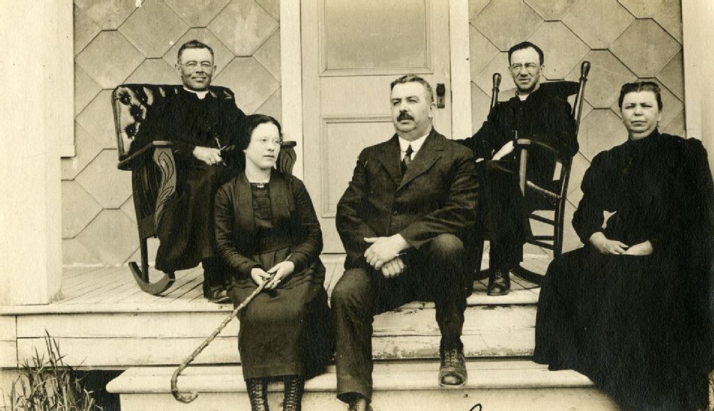Groupe sur une galerie : Monsieur le vicaire Beauregard, Napoléon Mercure, agent d'assurance, Madame veuve O. Dudemaine, ménagère, monsieur le curé Dudemaine, mademoiselle Graziella Massicotte, Juin 1921, Archives nationales à Montréal, Collection Monique Mercure-Vézina, (06M,P157,S4,P1039), Mercure-Vézina, Monique.