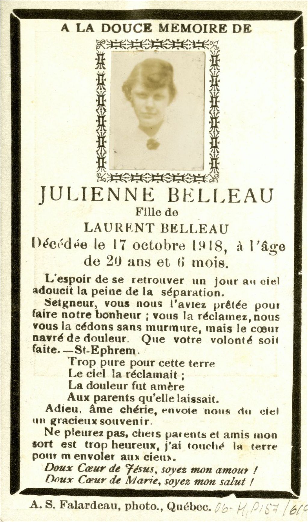 Portrait de Julienne Belleau, fille de Laurent Belleau, 17 octobre 1918, Archives nationales à Montréal, Collection Monique Mercure-Vézina, (06M,P157,S4,P61), Adolphe S. Falardeau.