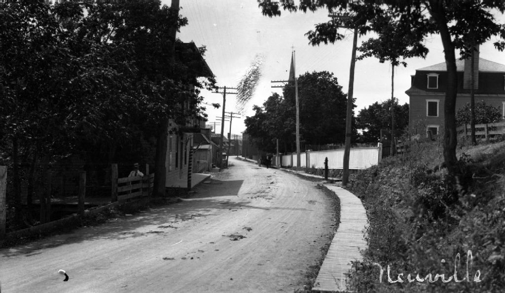 Neuville village, rue principale et trottoir de bois, [Vers 1925], Archives nationales à Montréal, Collection Monique Mercure-Vézina, (06M,P157,S4,P979), Mercure-Vézina, Monique.