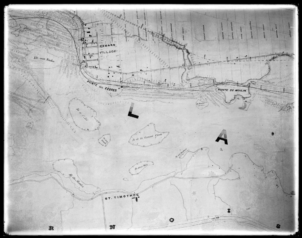 Ce négatif sur verre de grand format représente une carte montrant, entre autres, Les Cèdres, l'île aux Vaches et la pointe du moulin. Les noms des divers propriétaires de lots sont mentionnés