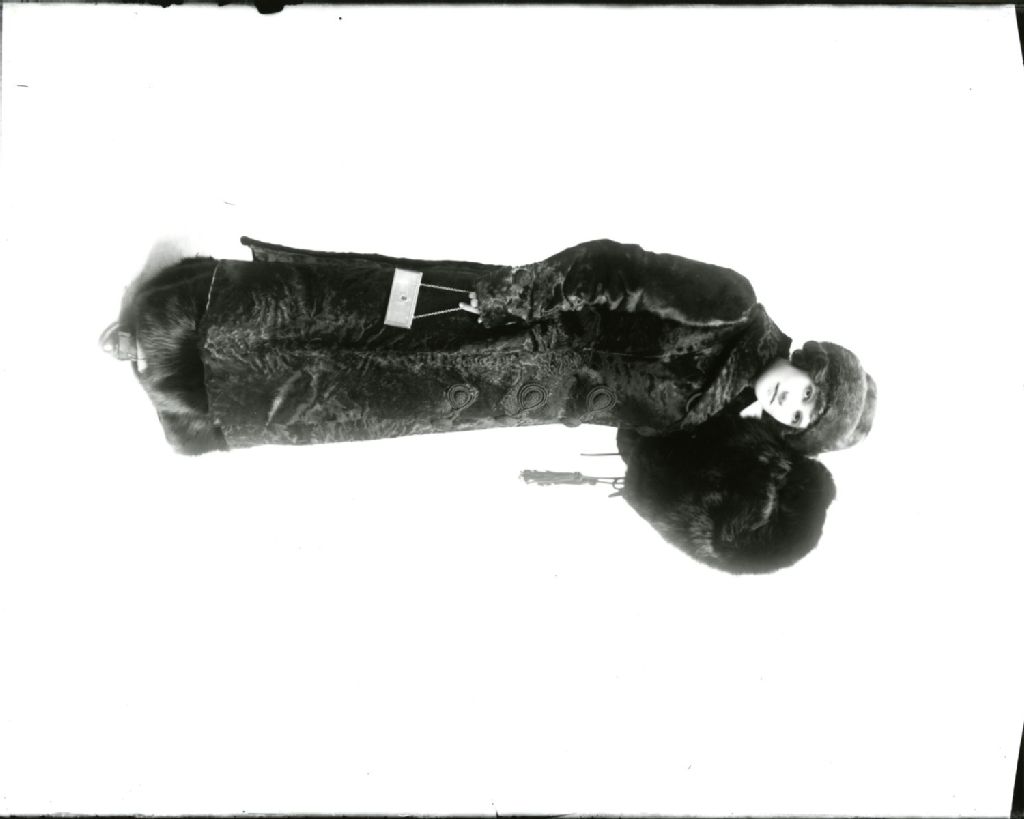Le négatif représente une femme portant manteau et manchon de fourrure