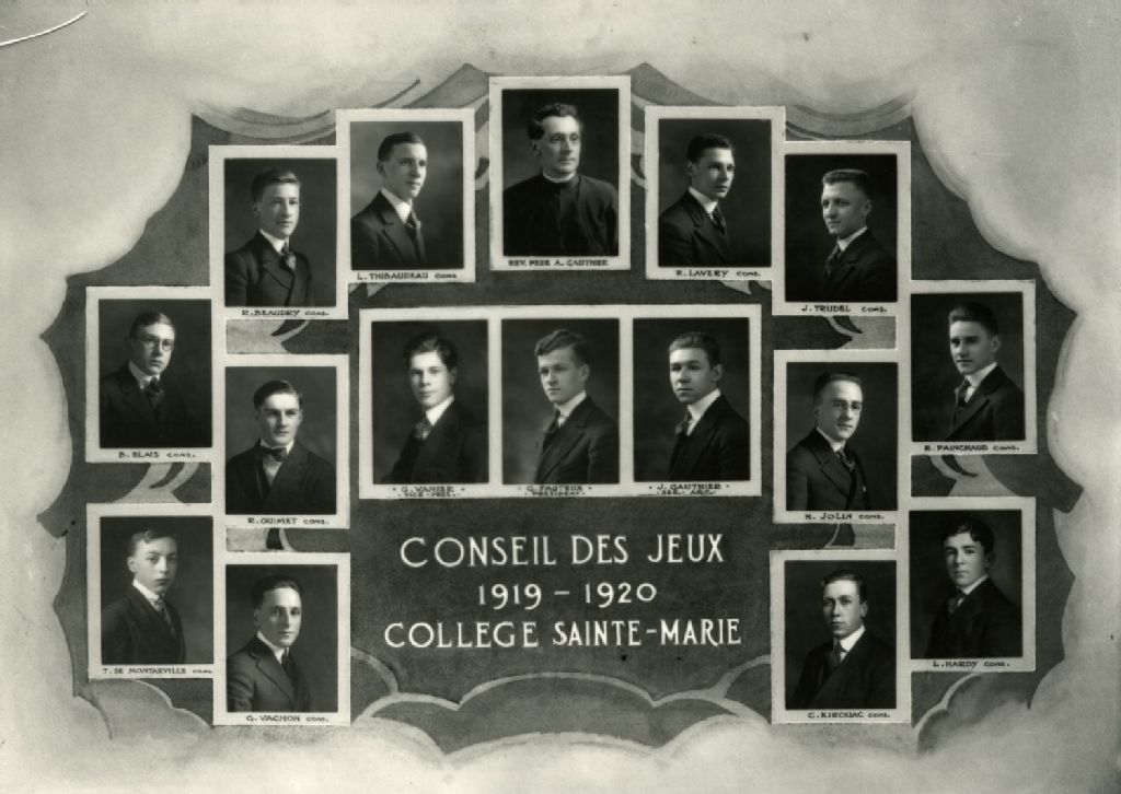 Le négatif représente les membres du Conseil des jeux du Collège Sainte Marie. Nous y reconnaissons T. De Montarville, B. Blais, R. Beaudry, L. Thibaudeau, Le père A. Gauthier, R. Lavery, J. trudel, R. Painchaud, L. Hardy. G. Vachon, R. Ouimet. G. Vanier, G. Fauteux, J. Gauthier, N. Jolin et C. Kirouac