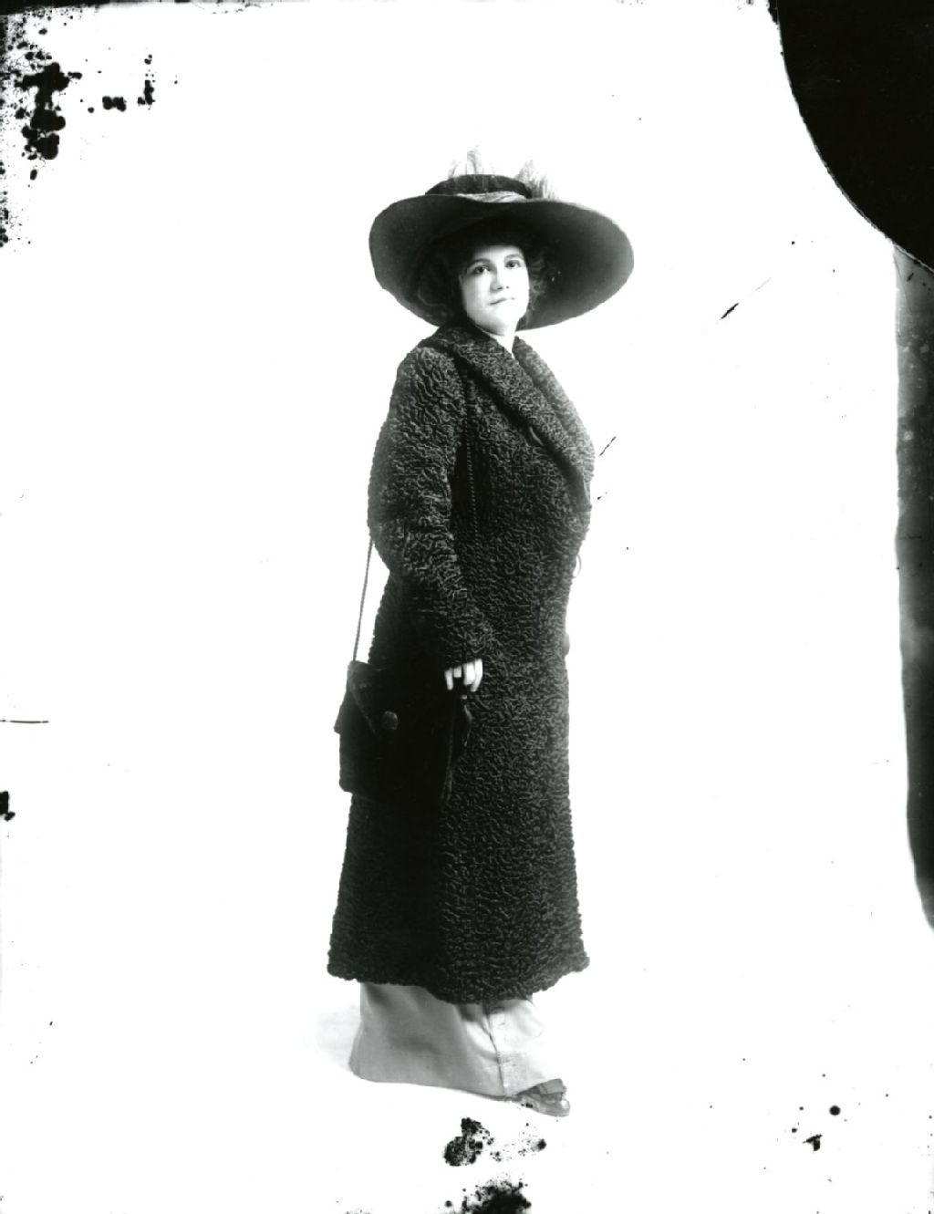 Le négatif représente une jeune femme portant un long mateau de fourrure et un large chapeau. Il pourrait s'agir de Mary Travers (La Bolduc)