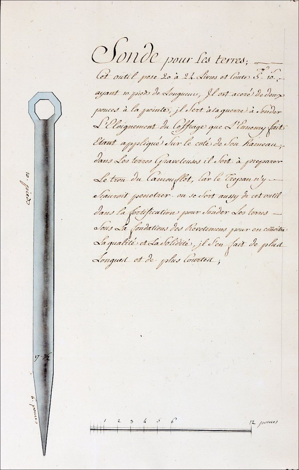 Dessin d'une sonde pour les terres. Cet outil prend la forme d'une grosse tarière de fer que l'on enfonce dans le sol pour évaluer, à diverses profondeurs, la nature du sol et le niveau des eaux. On l'utilise pour reconnaître les différentes couches de terrain ou pour forer des puits. Elle était également employée pour vérifier la solidité du terrain lors de l'érection des murs de fortifications. Outil plutôt spécialisé, la sonde est employée sur les chantiers nécessitant un forage préalable, particulièrement lors des constructions immobilières et militaires