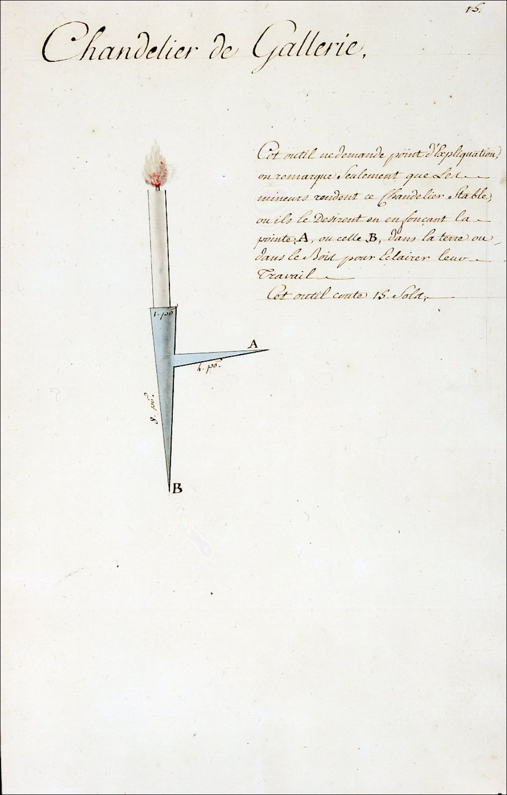 Dessin d'un chandelier de galerie muni de deux pics que le mineur ou le soldat peut enfoncer dans la terre ou le bois afin de stabiliser l'éclairage d'une chandelle. En terme de fortifications, on appelle « galerie », le passage souterrain pratiqué par les assiégeants afin de s'approcher à couvert d'une place ennemie. La galerie de mine est ce tunnel souterrain permettant de découvrir des filons et d'extraire le minerai. Outil plutôt spécialisé, le chandelier de galerie est employé sur les chantiers miniers et lors de constructions liées aux activités militaires