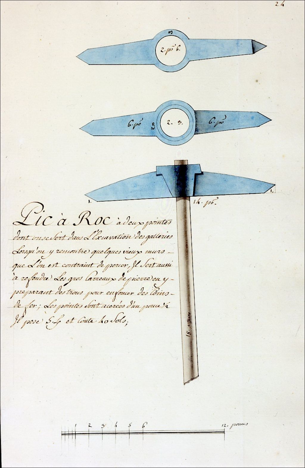 Pic à roc à deux pointes, [Vers 1740], Archives nationales à Montréal, Collection de dessins d'outils du XVIIIe siècle, (06M,P178,D24), Photographe non identifié.