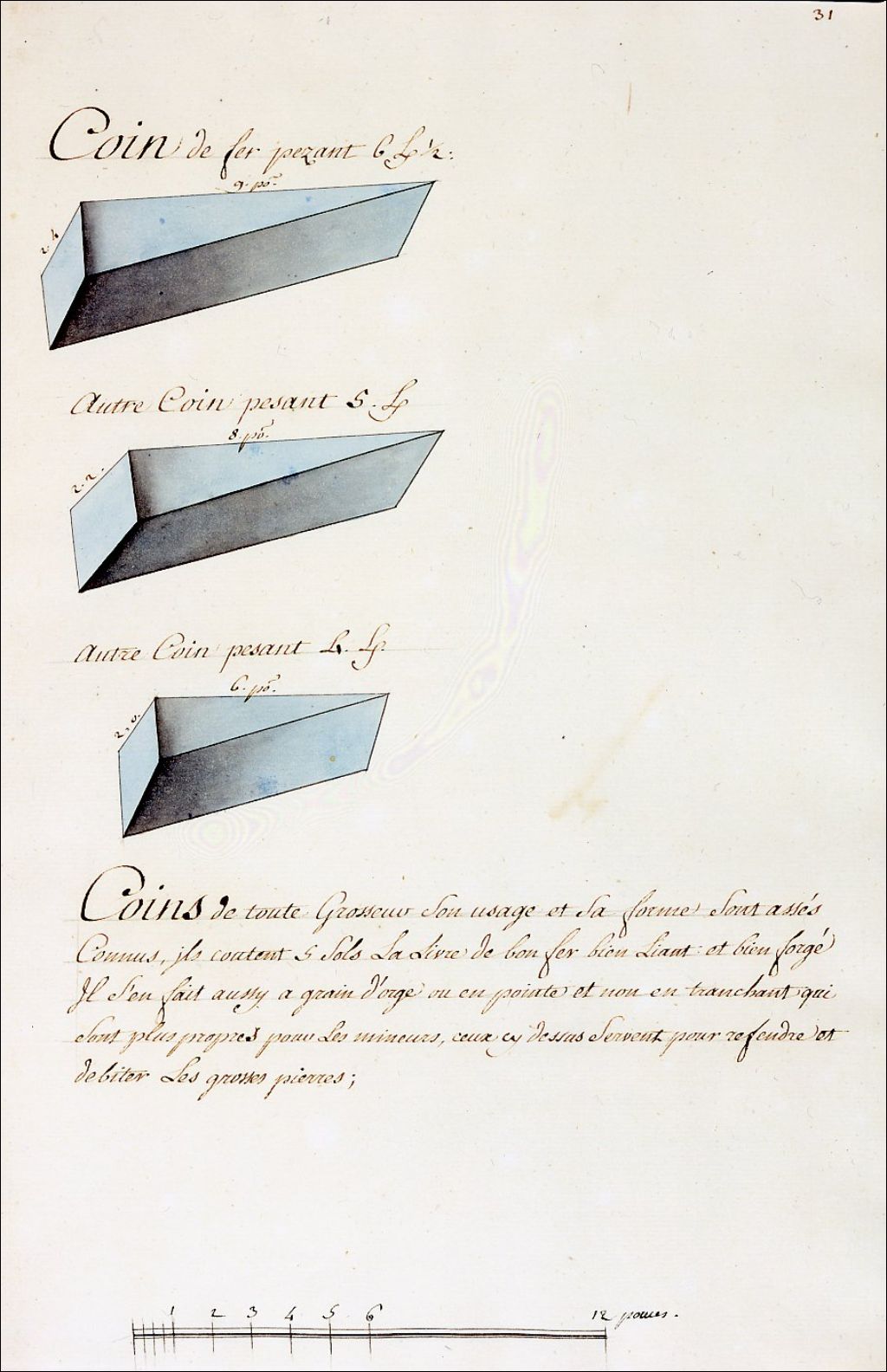 Dessin de coins de fer. Il s'agit de pièces, de forme prismatique triangulaire, utilisées pour rompre les pierres. On les insérait dans les fissures des pierres pour les dégrossir, les fragmenter ou les refendre. Destiné à un usage spécialisé, ces coins étaient employés dans le secteur des mines ainsi qu'en maçonnerie pour la mise en place de diverses constructions de nature immobilière, militaire, défensive, routière et minière
