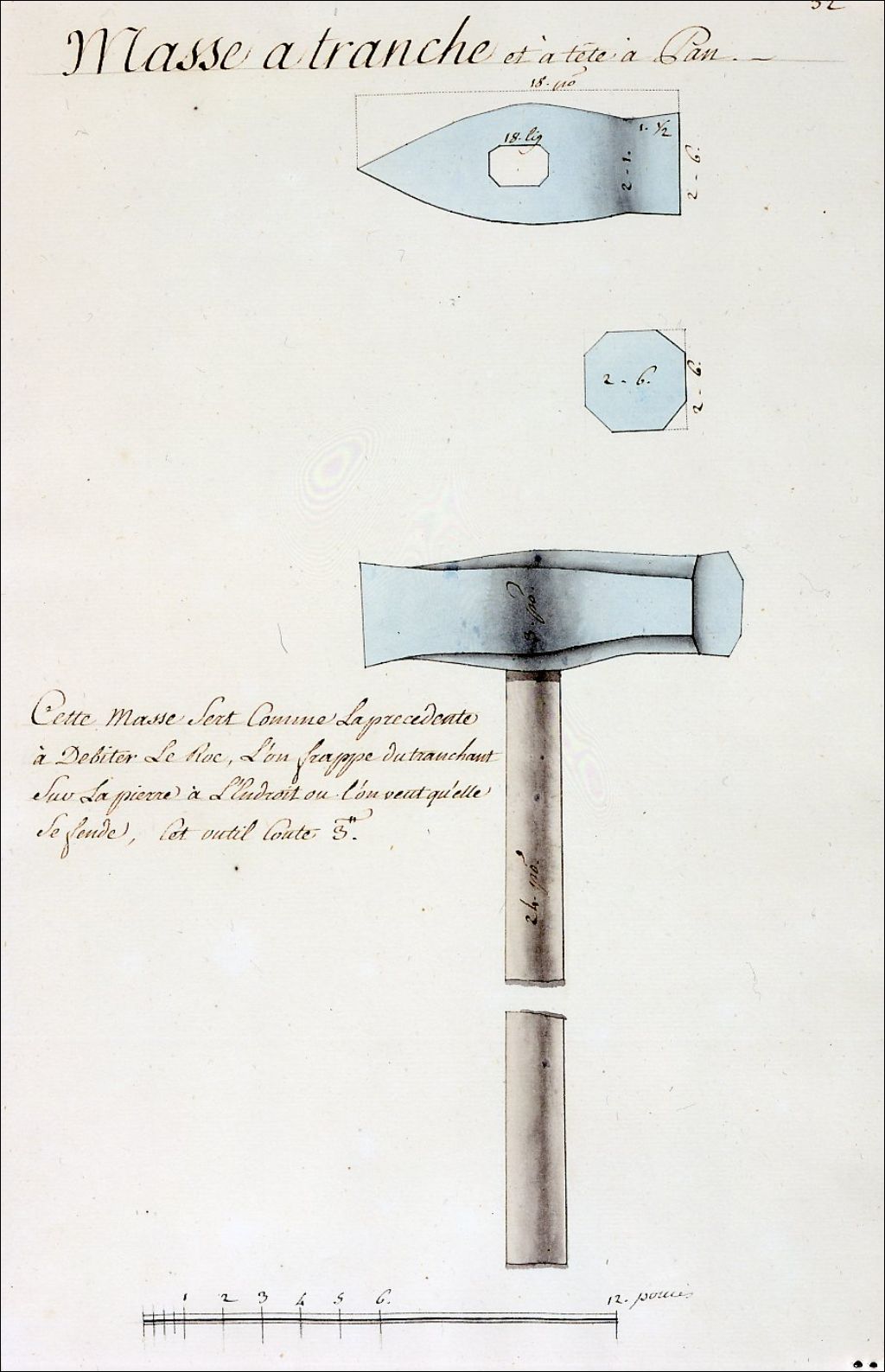 Dessin de masse à tranche, dite « à tête de pan ». Cet outil sert à tailler le roc. La technique consiste à frapper la pierre de la pointe du tranchant là où l'on veut qu'elle se fende. Cet outil spécialisé est employé dans le secteur des mines de même qu'en maçonnerie pour la mise en place de nombreuses infrastructures de nature immobilière, militaire, défensive, routière et minière. Selon les inventaires après décès répertoriés par le spécialiste en ethnologie du Québec, Robert-Lionel Séguin, les habitants de la Nouvelle-France utilisaient, à l'occasion, des masses de fer