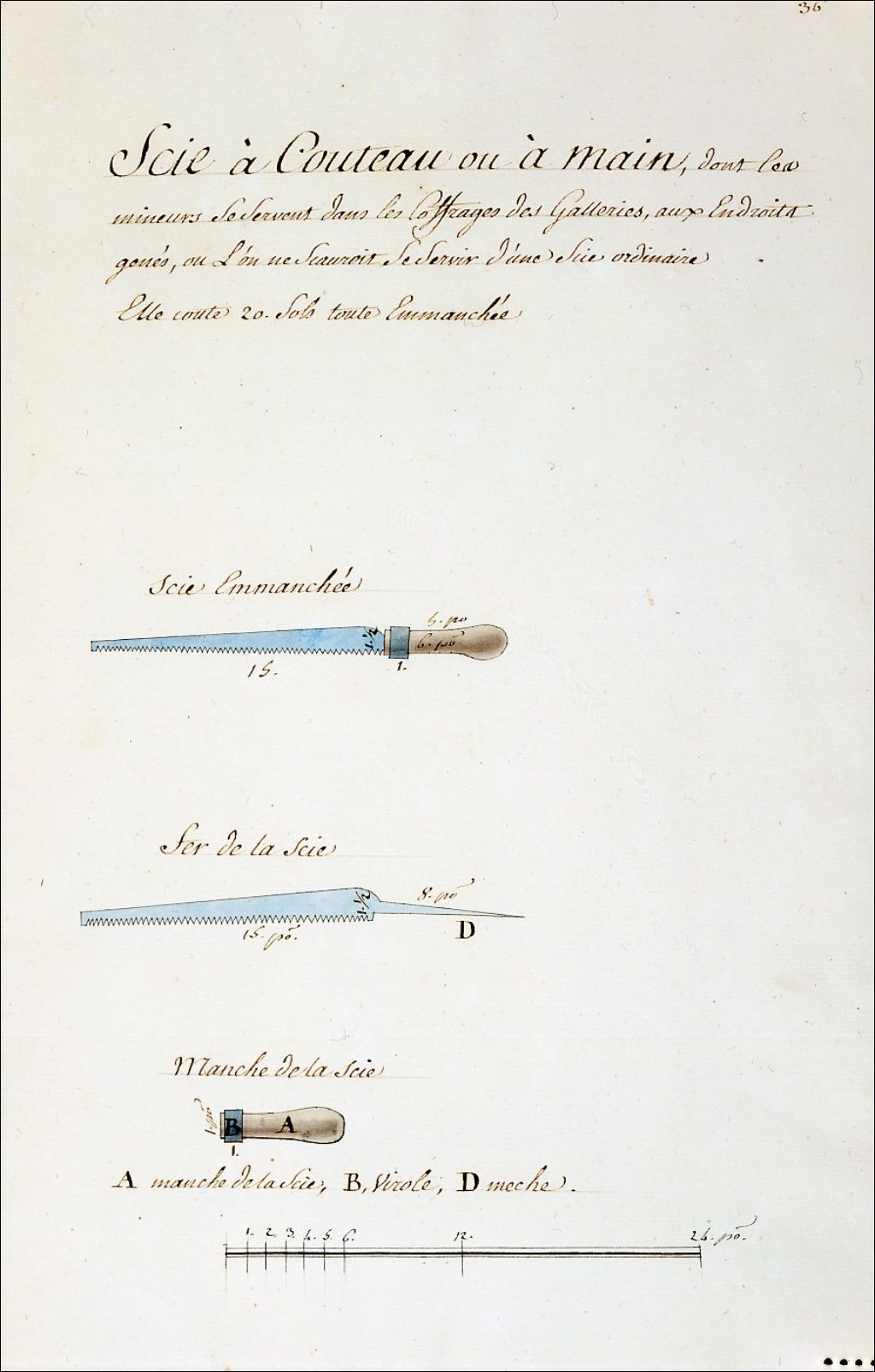 Dessin de scie à couteau ou à main. Les mineurs se servent de la scie à couteau au moment de la mise en place du coffrage des galeries, dans les endroits trop exigus pour recourir à l'emploi d'une scie ordinaire. Cette scie à main d'environ 40 cm de long est composée d'un simple fer finement dentelé, fixé à un court manche de bois. L'outil est employé particulièrement dans le secteur des mines