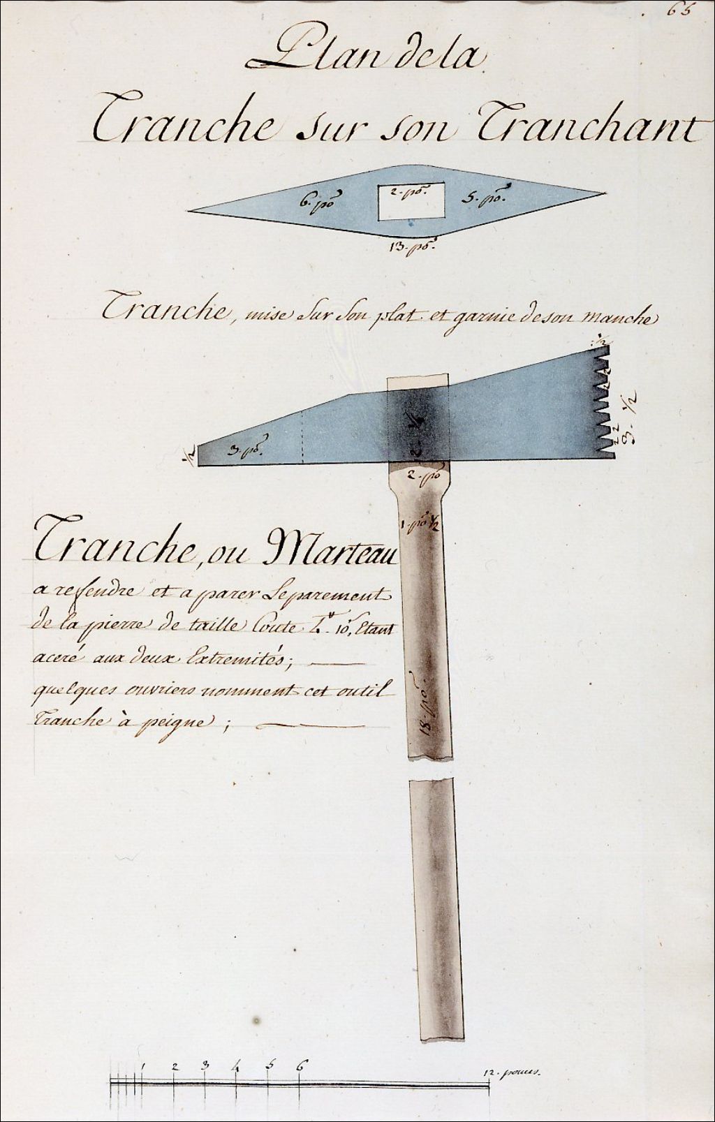 Dessin d'une tranche, appelée communément « tranche à peigne ». Il s'agit d'un marteau à panne droite et à tête dentelée dont les maçons et les tailleurs de pierre se servaient pour refendre et tailler le parement des ouvrages de maçonnerie. Plutôt spécialisé, cet outil est employé pour la finition dans les secteurs de la maçonnerie, du terrassement et du travail de la pierre en général. Il est utilisé dans les secteurs de la construction immobilière, militaire, défensive ou encore routière