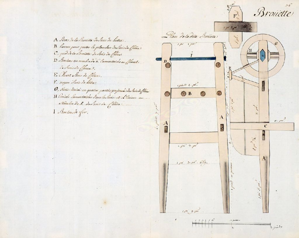 Dessin d'une brouette. Il s'agit d'un petit chariot de manutention doté d'une seule roue avant que l'on pousse ou tire à l'aide de deux brancards. Cette brouette a été fabriquée à partir de deux essences de bois dur, le hêtre et le chêne. Ses diverses composantes se trouvent clairement identifiées. La brouette est un outil de transport d'usage courant dans les divers secteurs de la construction comme dans la vie domestique des habitants