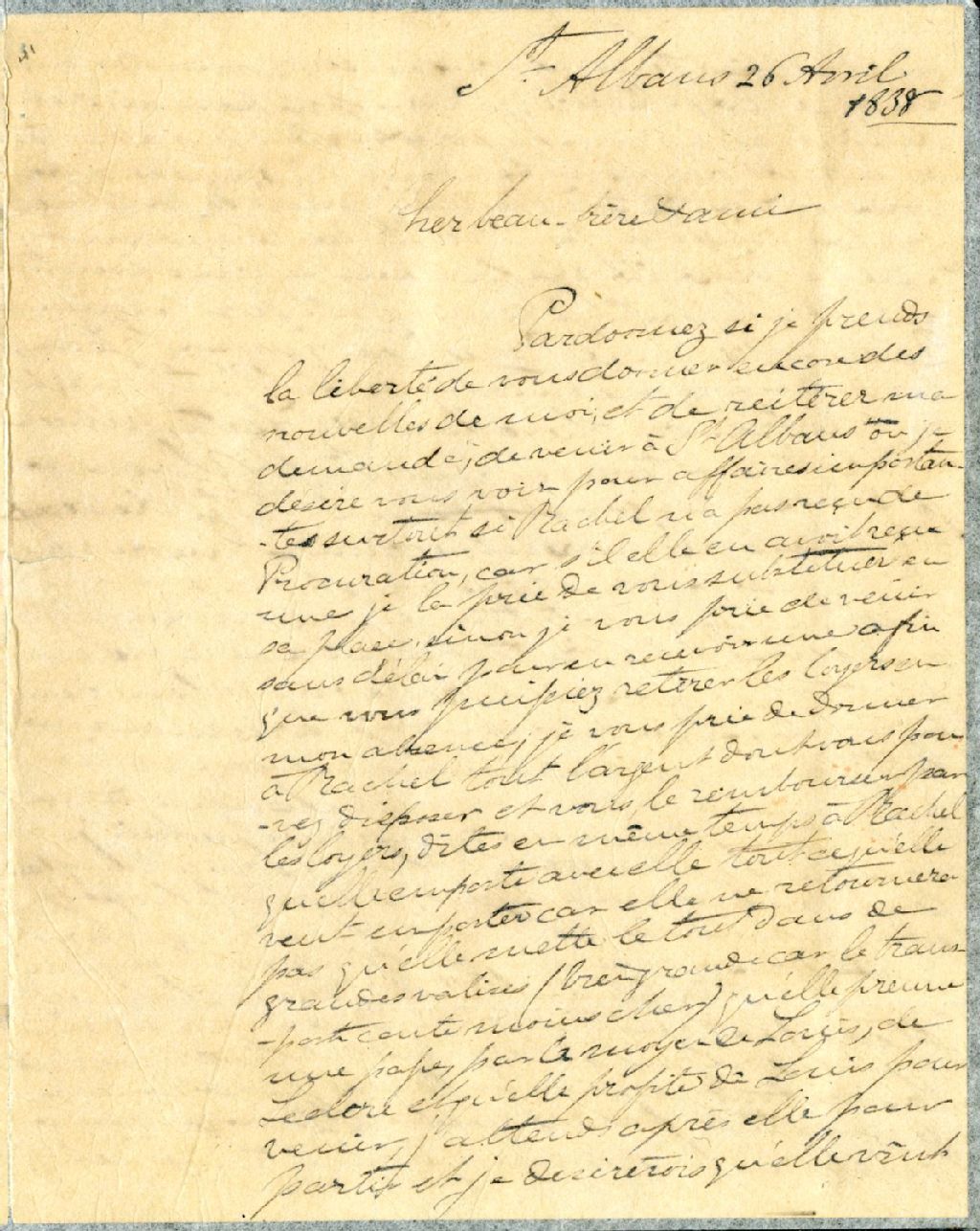- Lettre de F. M. Chamilly, chevalier de Lorimier, de Saint-Albans, États-Unis, à son beau-frère Georges Cadieux, notaire à Montréal
