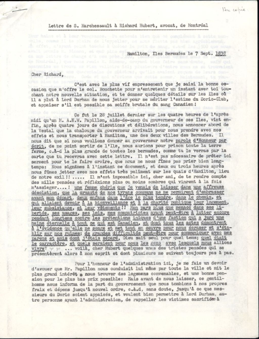 - Copie dactylographiée de la lettre de S. Marchessault à son ami Richard Hubert, avocat à Montréal