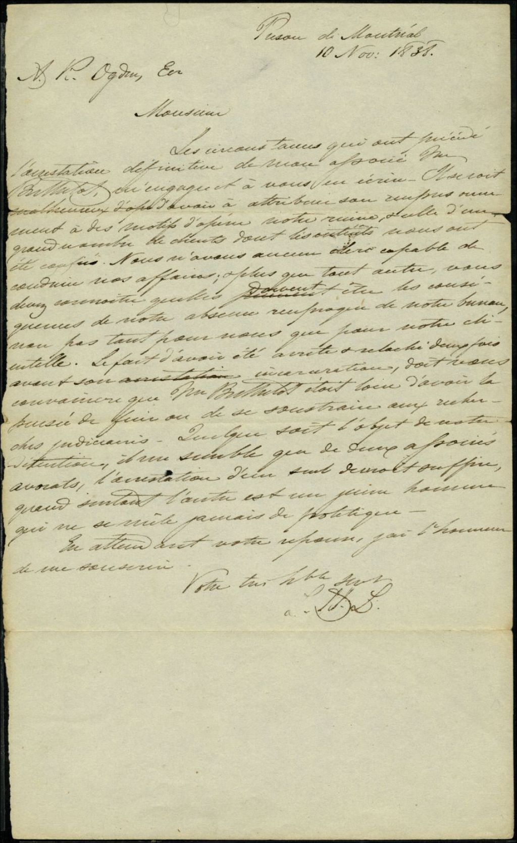 Lettre de L. H. Lafontaine, de la prison de Montréal, à A. R. Ogden, 10 novembre 1838, Archives nationales à Montréal, Collection rébellion de 1837-1838, (06M,P224,S1,P53).