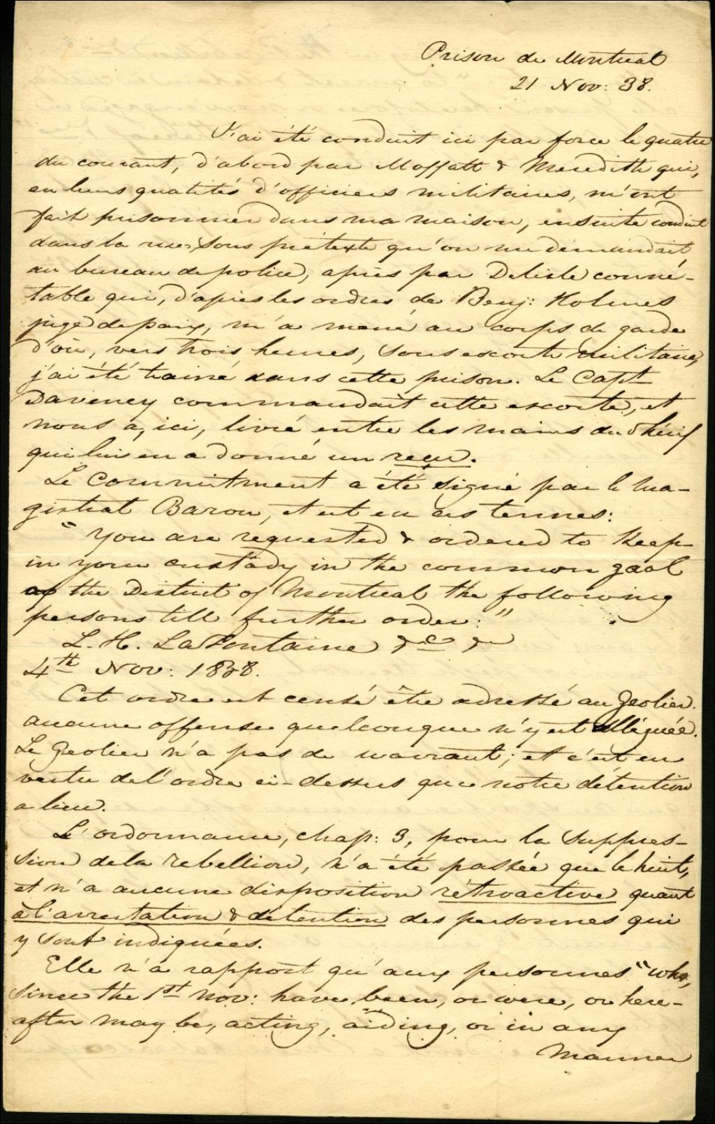 - L. H. Lafontaine déclare les circonstances de son arrestation lors du 4 novembre 1838 et par le fait même exige sa libération