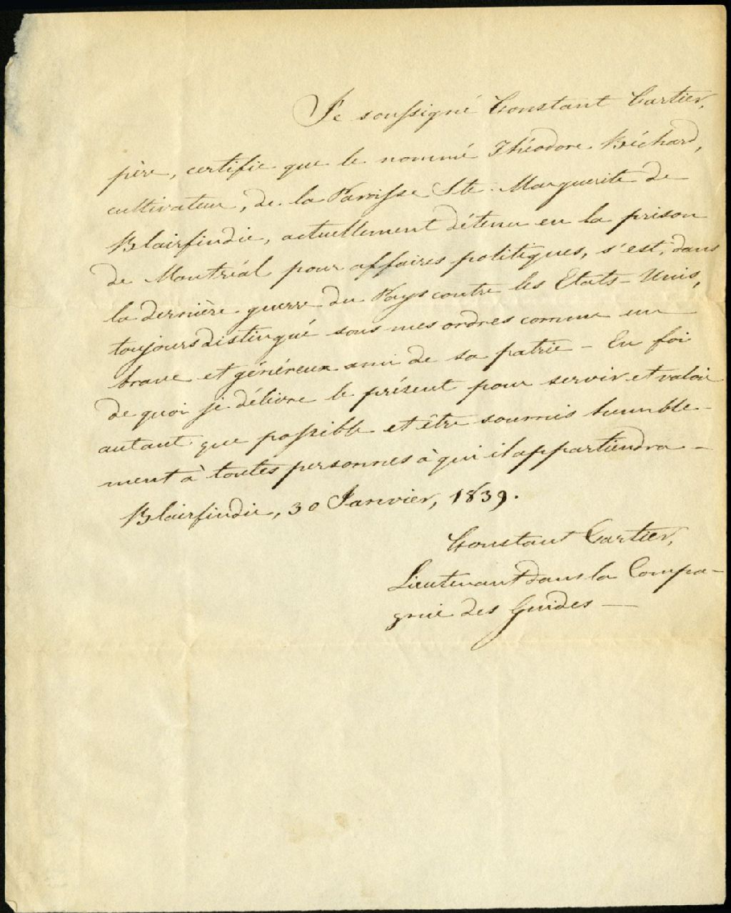 Lettre de recommandation de Constant Cartier, de Blairfindie, pour Théodore Béchard, prisonnier à Montréal, 30 janvier 1839, Archives nationales à Montréal, Collection rébellion de 1837-1838, (06M,P224,S1,P74).