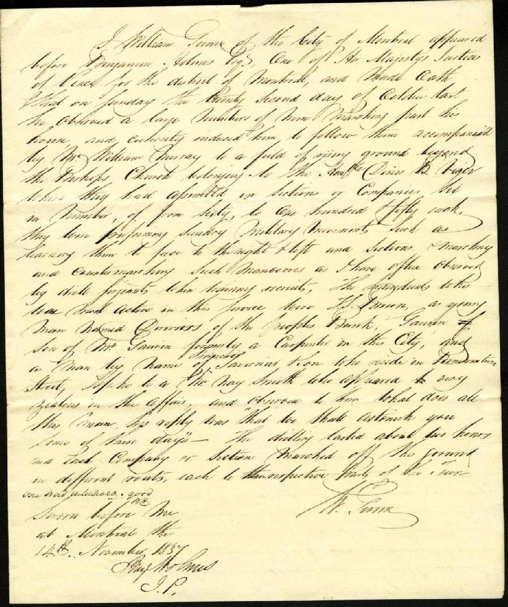 Déposition de William Gunn, devant le juge de paix Benjamin Holmes, à Montréal, 14 novembre 1837, Archives nationales à Montréal, Collection rébellion de 1837-1838, (06M,P224,S2,P10).