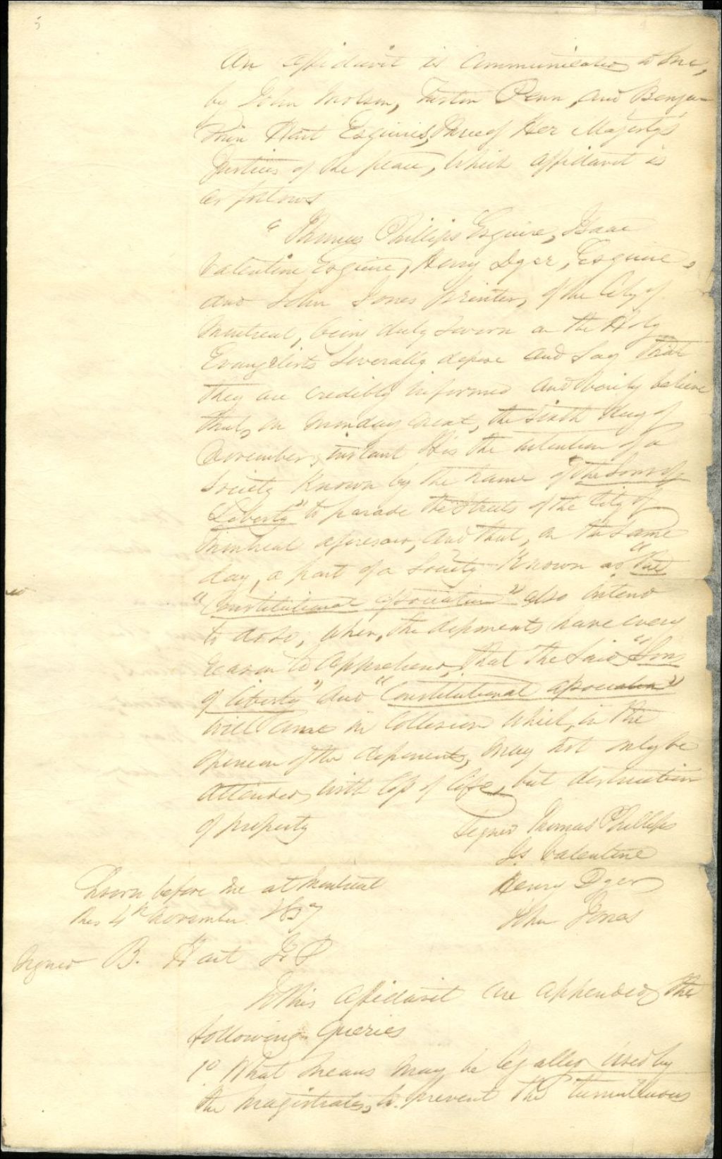 - La déposition sous serment et l'avis du conseiller juridique de la Couronne concernent les activités, les intentions et l'affrontement du 6 novembre 1837 des Fils de la liberté versus le Doric Club