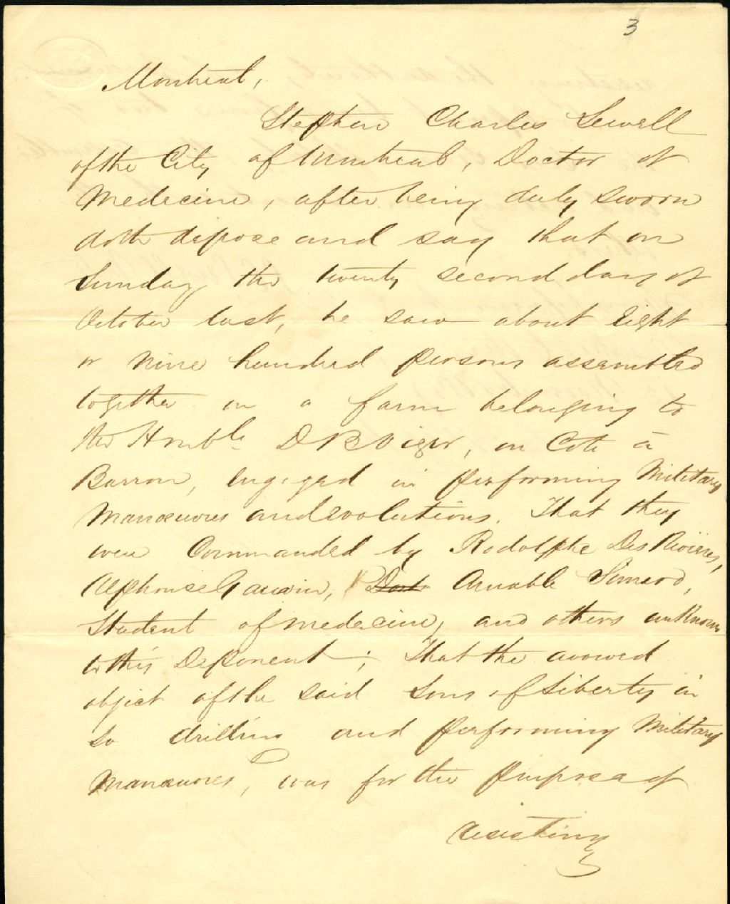 - Stephen Charles Sewell a vu un rassemblement des Fils de la liberté le 22 octobre 1837, sur la côte à Barron, propriété de B. Viger, qui faisaient des exercices militaires dans le but de renverser le gouvernement. II en nomme quelques-uns