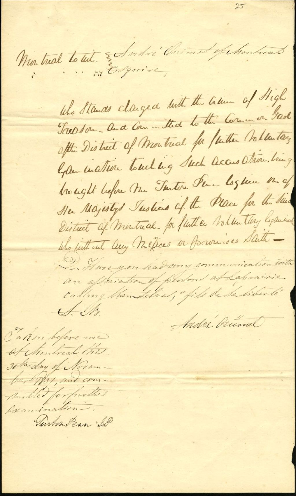 Court interrogatoire d'André Ouimet, devant le juge de paix Turton Penn, à Montréal, 30 novembre 1837, Archives nationales à Montréal, Collection rébellion de 1837-1838, (06M,P224,S3,P28).