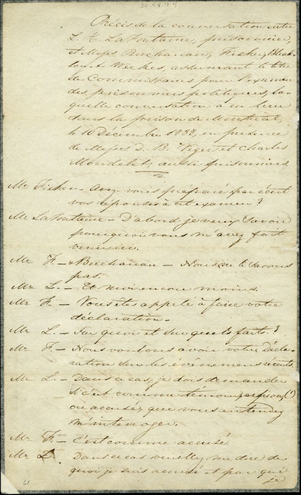 - Cette conversation se passe entre 3 prisonniers et 4 commissaires. Ces derniers désirent une déclaration de Lafontaine sur les événements. Lafontaine désire connaître quelle accusation est portée contre lui et par qui? Les questions seront élucidées