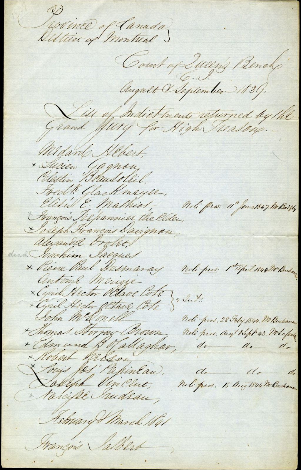 Liste d'inculpations pour haute trahison prononcées par le Grand Jury, de la Cour du Banc de la Reine, Août 1839-septembre 1839, Archives nationales à Montréal, Collection rébellion de 1837-1838, (06M,P224,S3,P88).