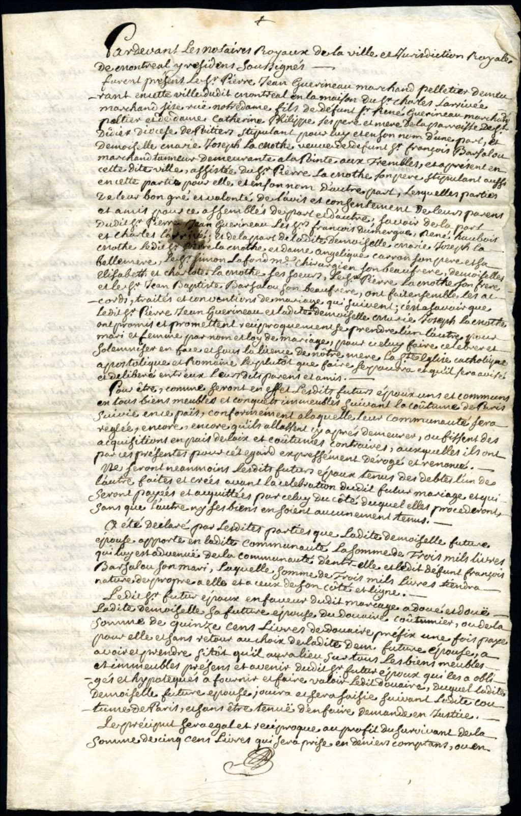 - Contrat de mariage entre Pierre-Jean Guerineau, marchant pelletier, de la ville de Montréal, rue Notre-Dame, fils de feu René Guerineau, marchand pelletier et de Catherine Philippe, de la paroisse de Saint-Didier, diocèse de Poitiers et Marie Josèphe Lamotte, de la Pointe- aux-Trembles, veuve de François Barsalou, marchand tanneur, fille de Pierre Lamothe