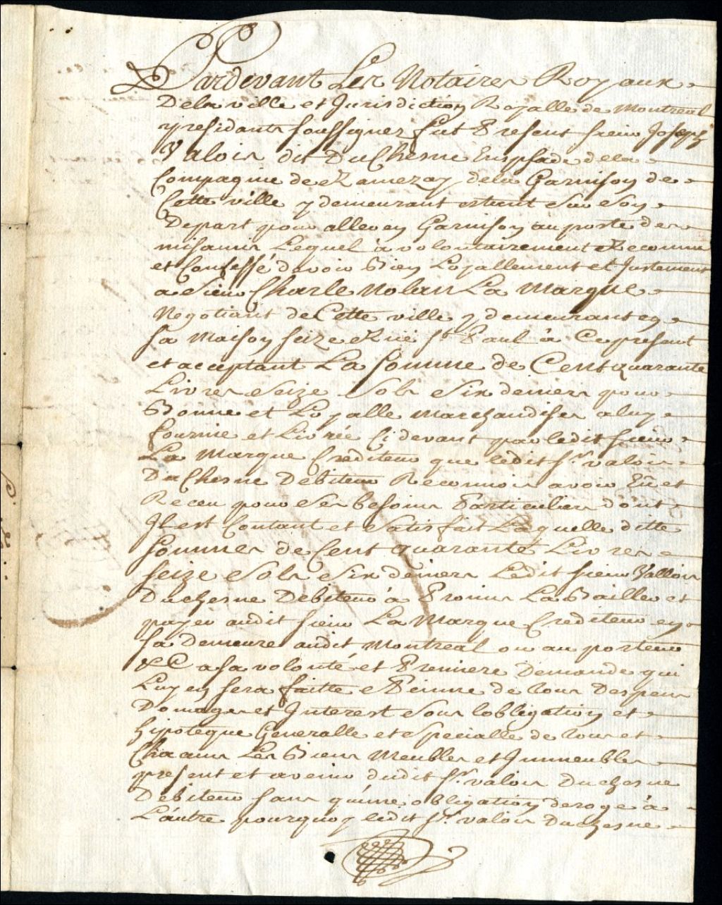Procuration de Joseph Valois dit Duchesne, 15 juin 1741-17 juin 1745, Archives nationales à Montréal, Fonds Charles Nolan Lamarque, (06M,P239,S2,P6).
