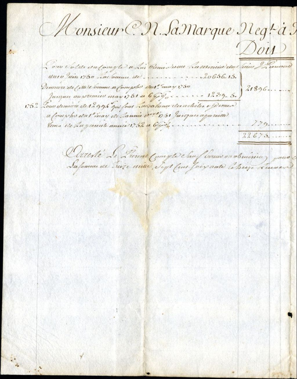 - Cette pièce est un état de compte ancien et le compte nouveau. Des chiffres, des bilans de ce que Nolan Lamarque doit à Pascaud. On constate que le solde dû est maintenant de 22 675 Livres