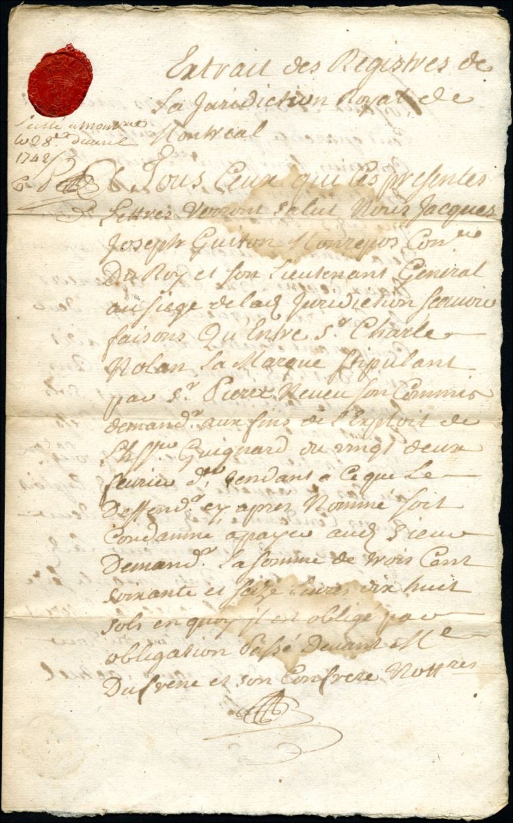 Extrait des registres de la juridiction royale de Montréal