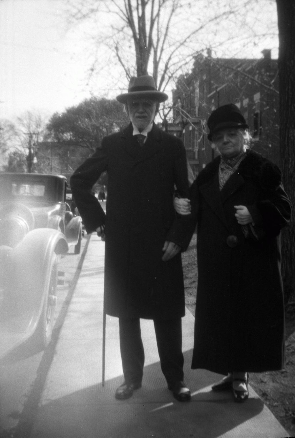 Antoine et Joséphine Hudon marchant sur le trottoir, [Vers 1930], Archives nationales à Montréal, Fonds Antoine Hudon, (06M,P280,S2,P19), Photographe non identifié.