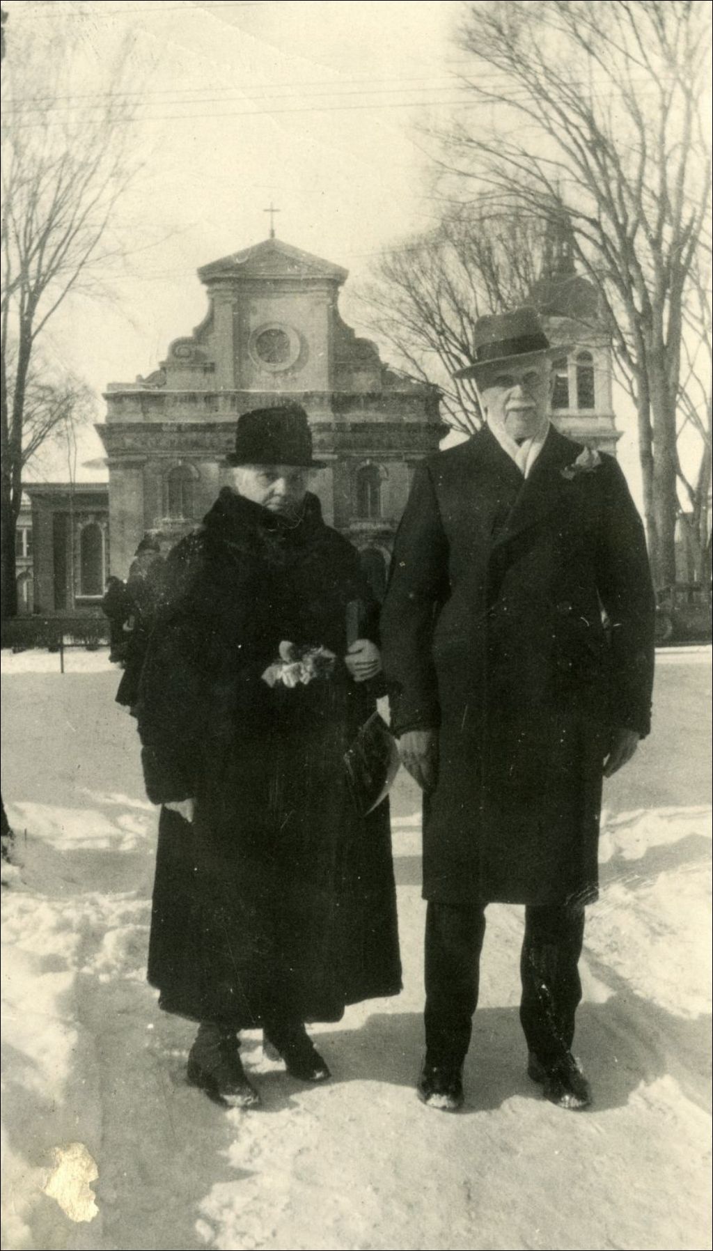 Joséphine et Antoine devant l'église Notre-Dame-de-Grâce le jour de leurs noces de diamants, 19 novembre 1933, Archives nationales à Montréal, Fonds Antoine Hudon, (06M,P280,S3,P163), Photographe non identifié.