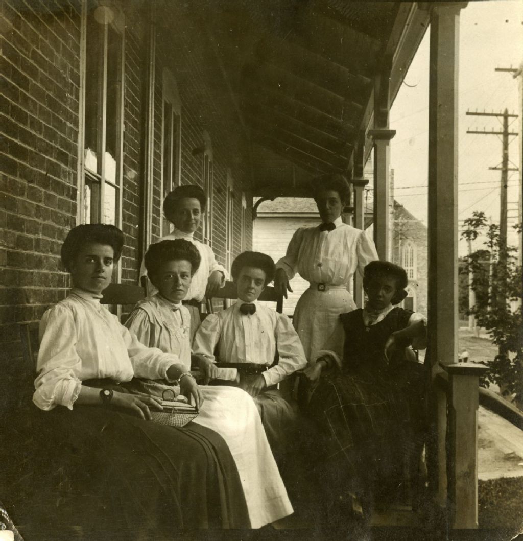 Marguerite, Berthilde, Éva, Gertrude et Marie-Thérèse Hudon sur un balcon à Rivière-du-Loup
