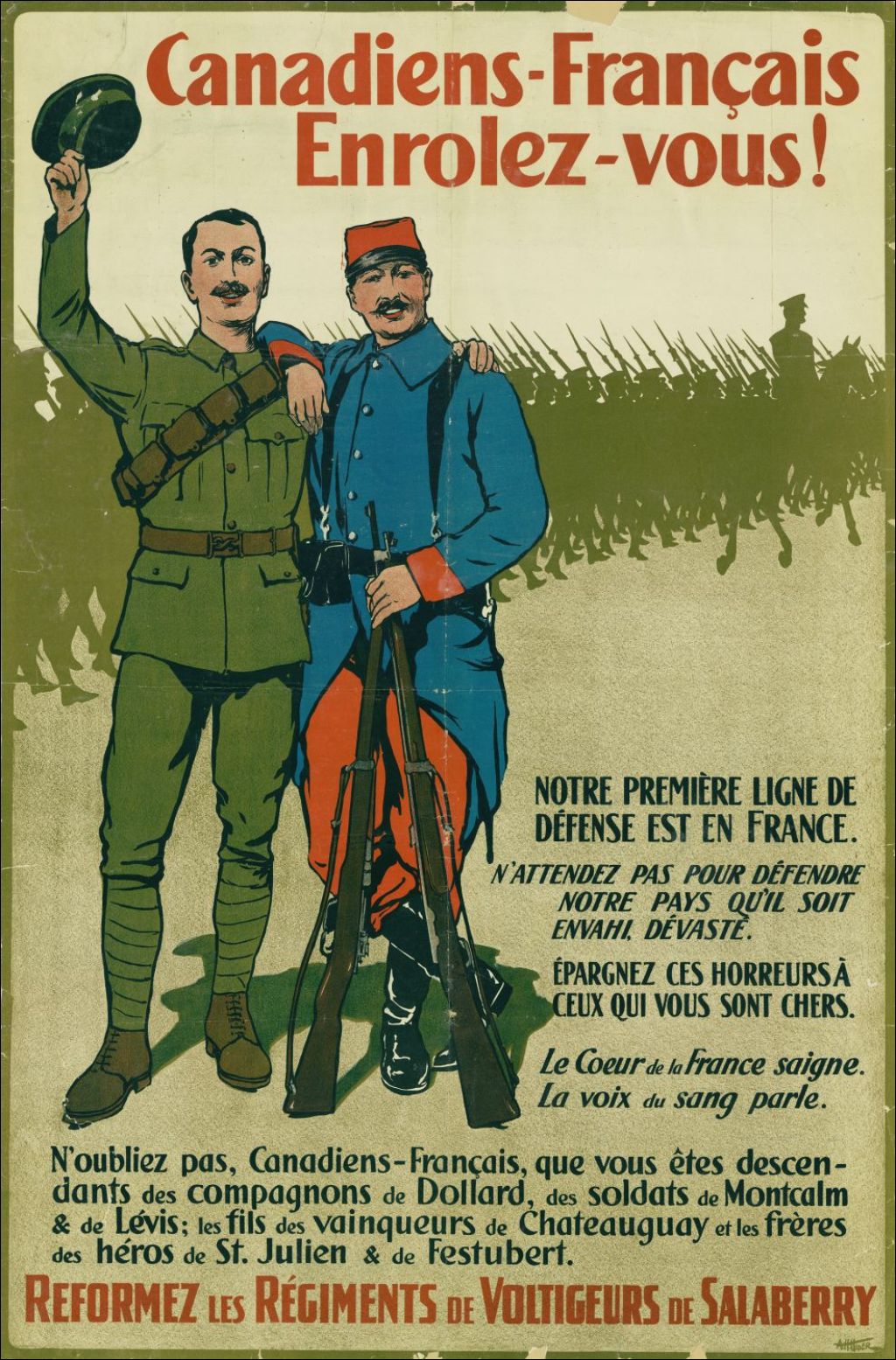 Cette pièce est une affiche invitant les citoyens francophones à reformer, d'une certaine manière, les Régiments de Voltigeurs de Salaberry en s'enrôlant lors de la Première Guerre mondiale. Un soldat canadien y est illustré auprès d'un soldat de l'armée française