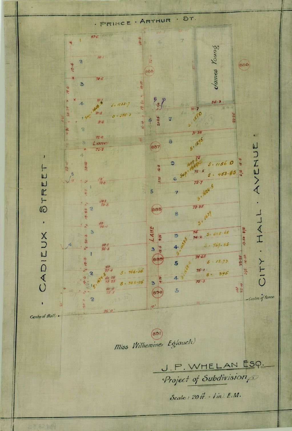 Ce dossier contient deux plans établissant un projet de subdivision de terrains appartenant entre autres à John P. Whelan, Mary Quinn son épouse, Wilhemina Eglauch et Jos Wallace. Il s'agit des cadastres nos 886 à 892 délimités par les rues Prince-Arthur et Cadieux ainsi que l'avenue City Hall à Montréal