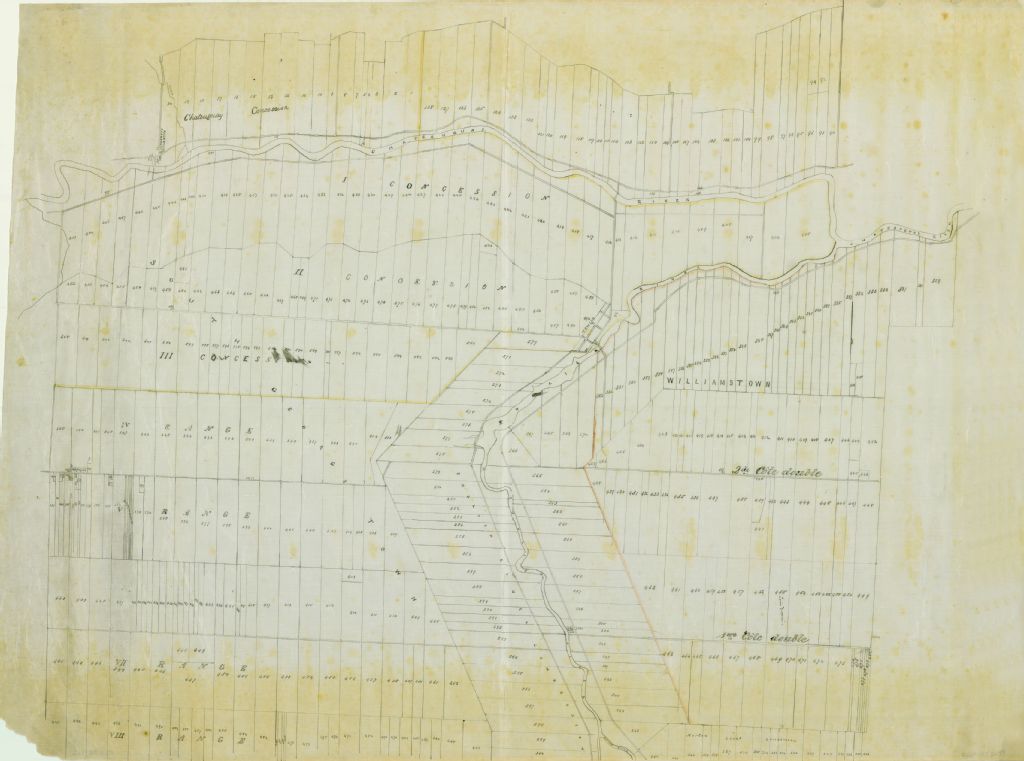 Cette pièce montre les terres de Willamstown et de Georgetown séparées par la rivière des Anglais (English River) dans la seigneurie de Beauharnois, ainsi que celles situées de part et d'autre de la rivière Chateauguay