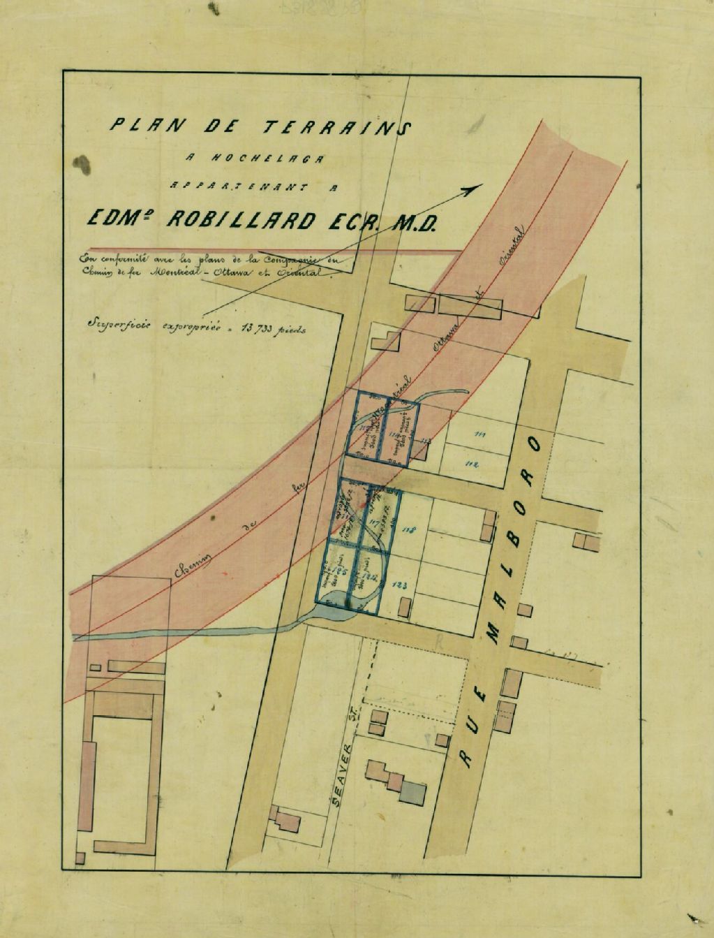 Cette pièce montre des lots en expropriation pour le passage du chemin de fer Montréal-Ottawa et Oriental près des rues Malboro et Seaver à Hochelaga