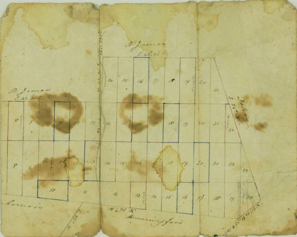 Cette pièce montre la division des terres du petit territoire en franc et commun soccage de Babyville ceinturé par les seigneuries de Beauharnois, Saint-James, De Léry et du canton de Hemmingford