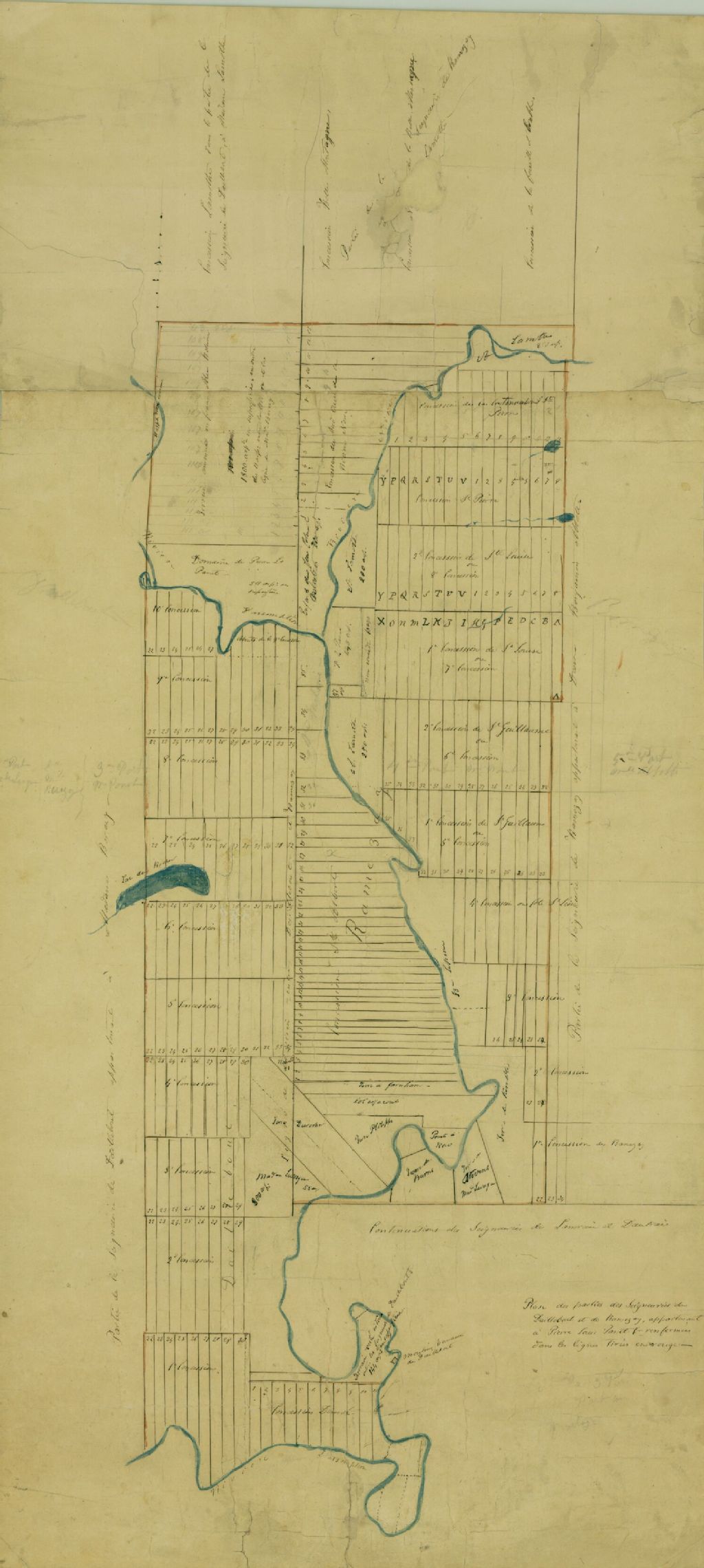 Plan des parties des Seigneuries de Daillebout et de Ramezay appartenant à Pierre Louis Panet Esq. renfermées dans les lignes tirées en rouge