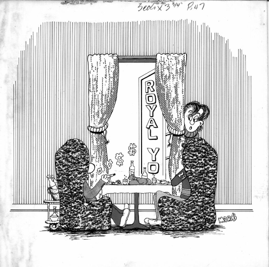 "Tit-Clin épiant un promoteur et un joueur de hockey discutant affaires", 30 mai 1974, Archives nationales à Montréal, Fonds Jean-Marc Phaneuf, (06M,P575,S4,SS1,P23), Jean-Marc Phaneuf.
