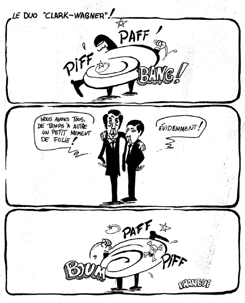 Les hauts et les bas de l'amitié de Joe Clark et de Claude Wagner. Entre deux bagarres, Joe Clark dit : "Nous avons tous, de temps à autre un petit moment de folie!" Claude Wagner répond : "Évidemment!"