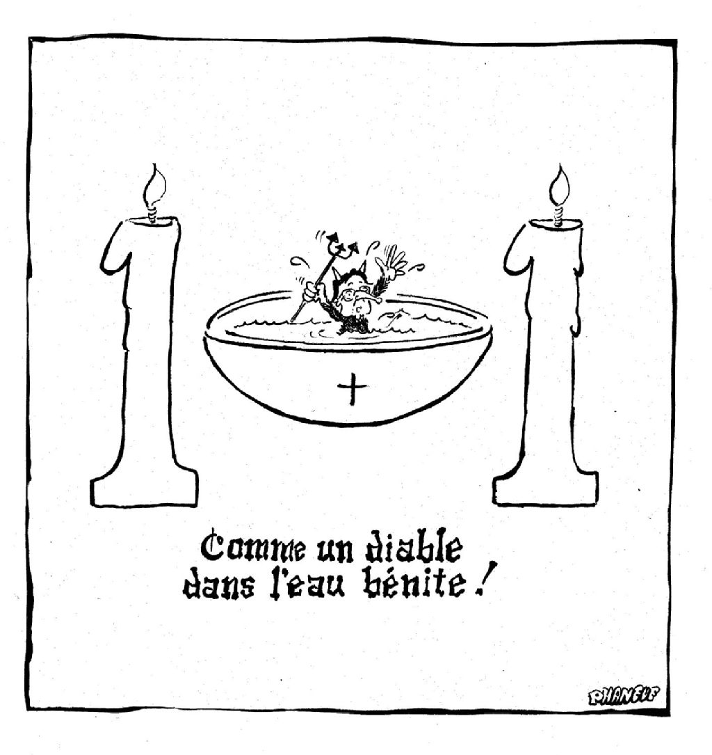Robert Bourassa, déguisé en diable, cherche à sortir du bassin d'eau formé par le 0 du chiffre 101 de la loi du nême nom