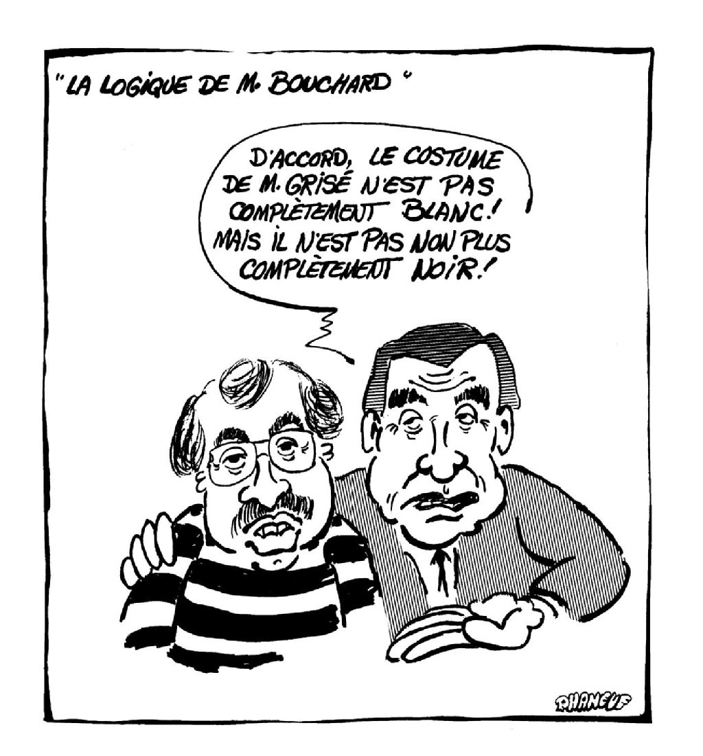 Benoît Bouchard montre Richard Grisé et dit : "D'accord, le costUme de M. Grisé n'est pas complètement blanc! Mais il n'est pas non plus complètement noir!"