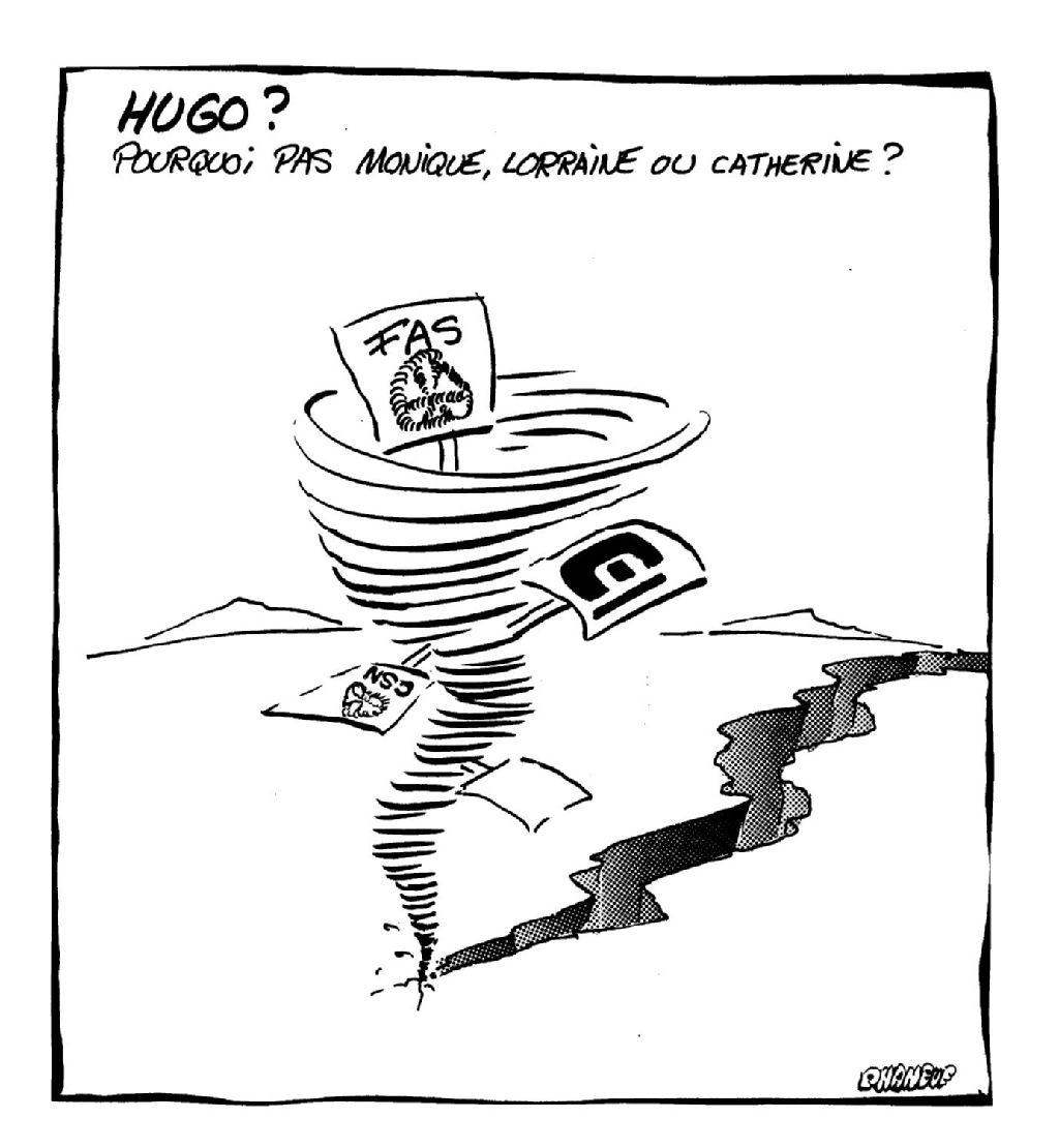 Hugo? Pourquoi pas Monique, Lorraine ou Catherine, [Vers 1988], Archives nationales à Montréal, Fonds Jean-Marc Phaneuf, (06M,P575,S4,SS4,P156), Jean-Marc Phaneuf.
