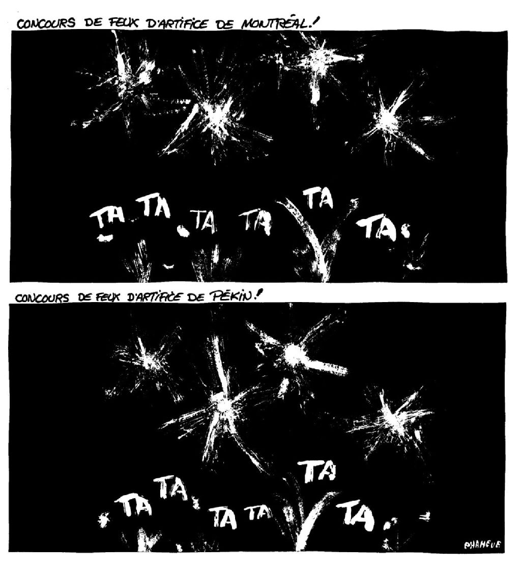 Deux caricatures représentent des feux d'artifice. Le premier, celui Montréal et l'autre, celui de Pékin