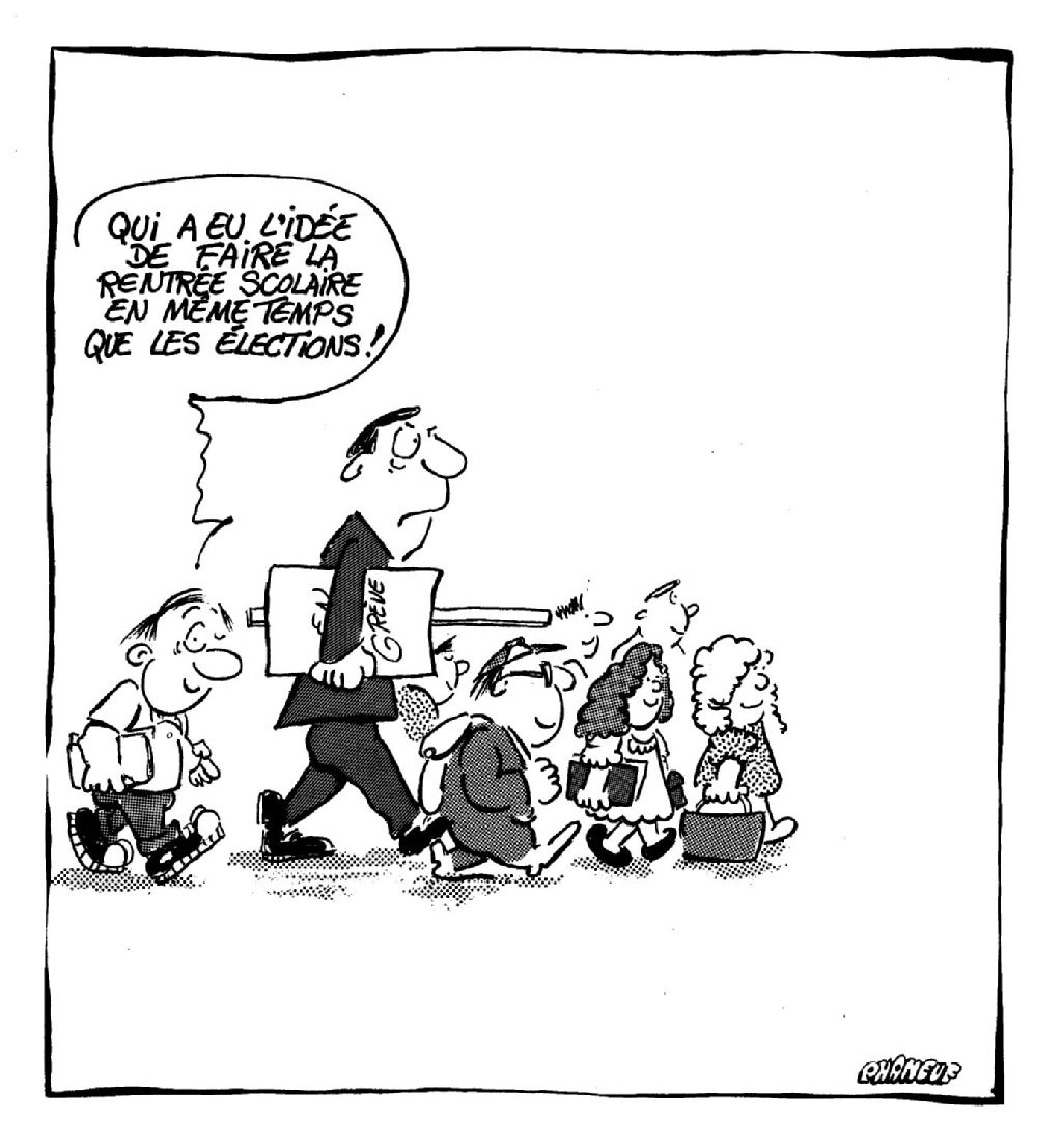Un personnage porte en-dessus du bras droit une pancarte portant l'inscription : "En grève". Cette personne suit un groupe de jeune qui débutent leur année scolaire. Un des garçons dit : "Qui a eu l'idée de faire la rentrée scolaire en même temps que les élections"