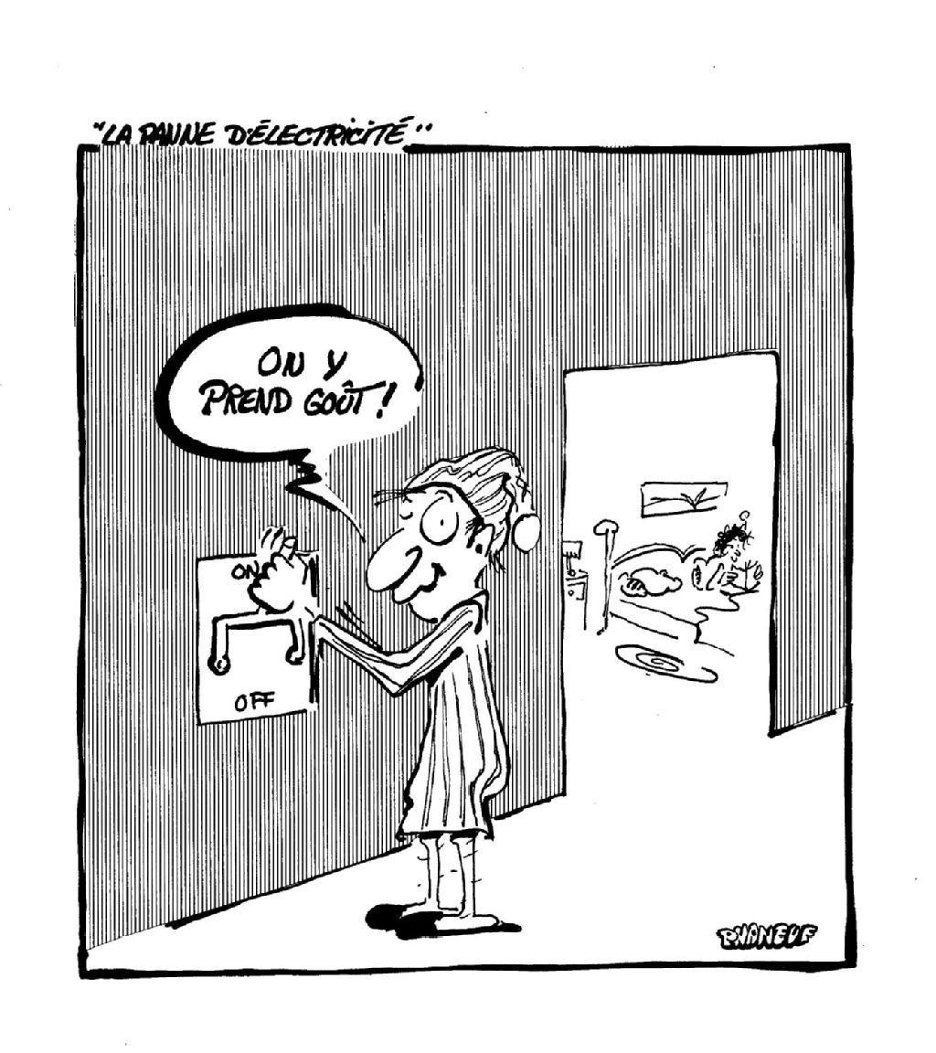 Un homme en pyjama s'apprête à interrompre le courant en disant : "On y prend goût!"